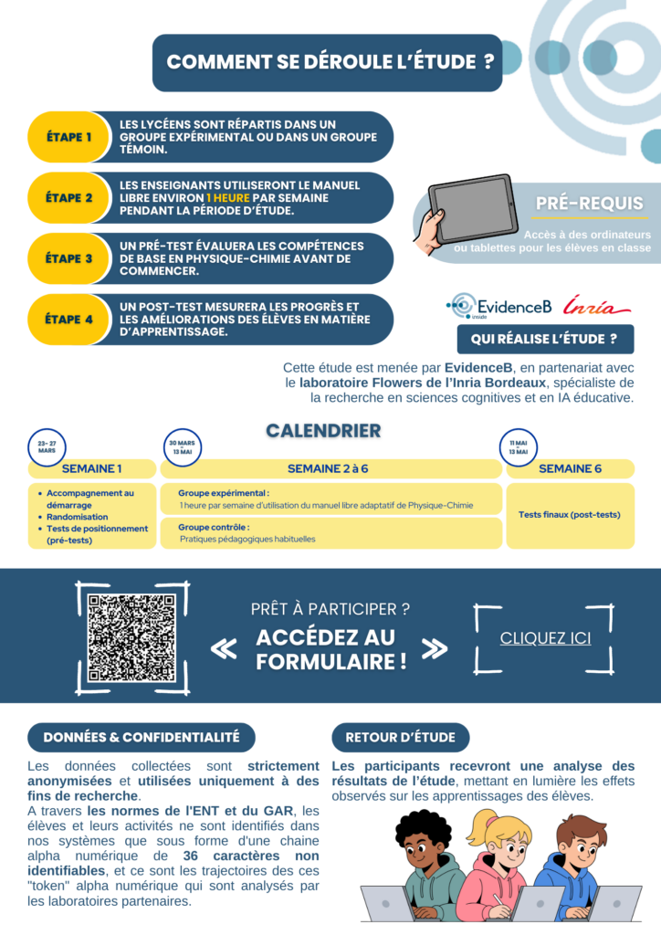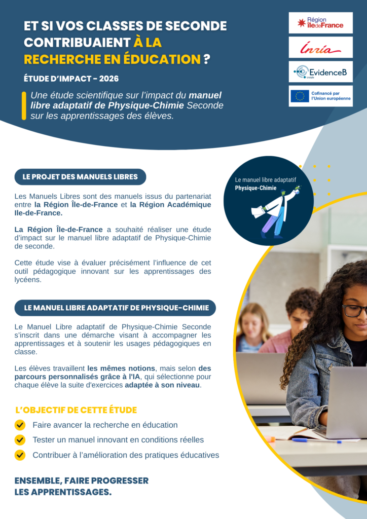 Cette étude est menée par la Région Île-de-France en collaboration avec l’équipe de recherche de l’Inria / Flowers, afin d’analyser l’impact de cette ressource sur les apprentissages des élèves.